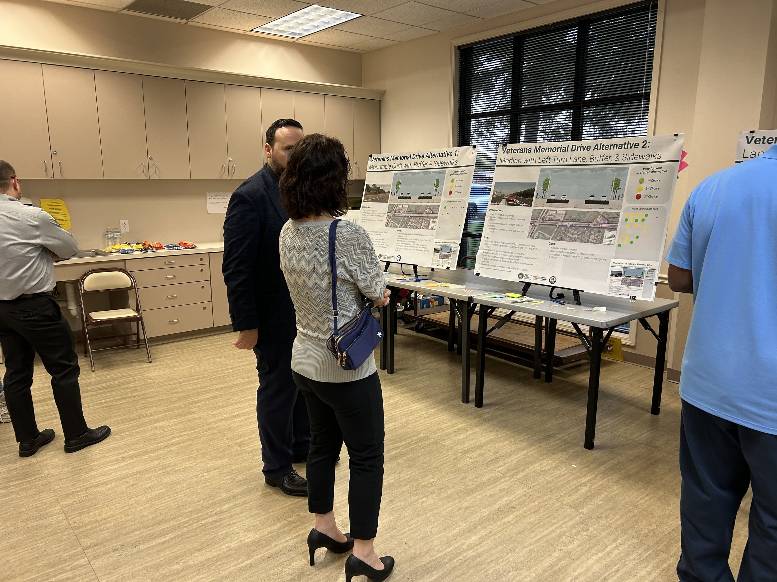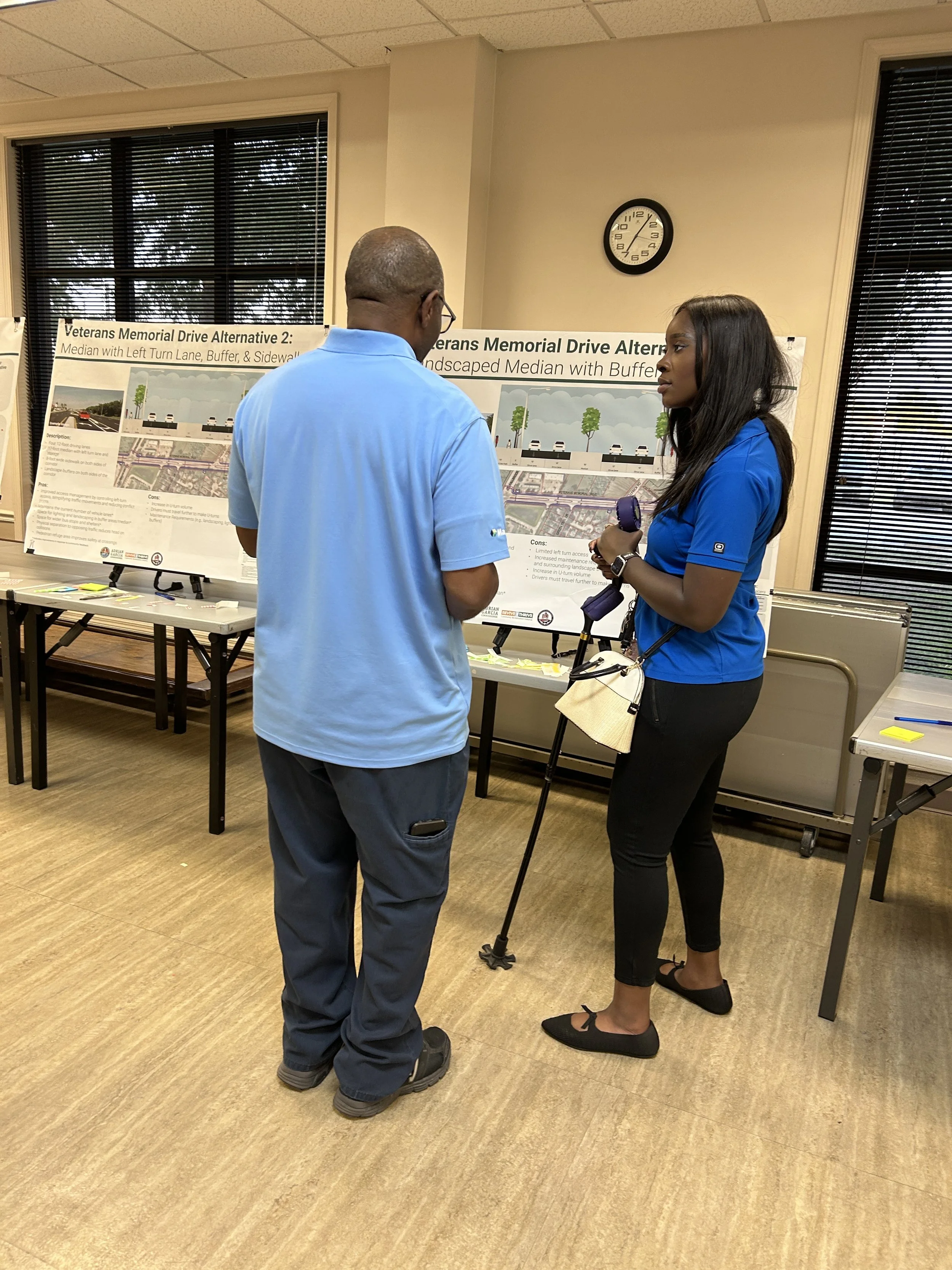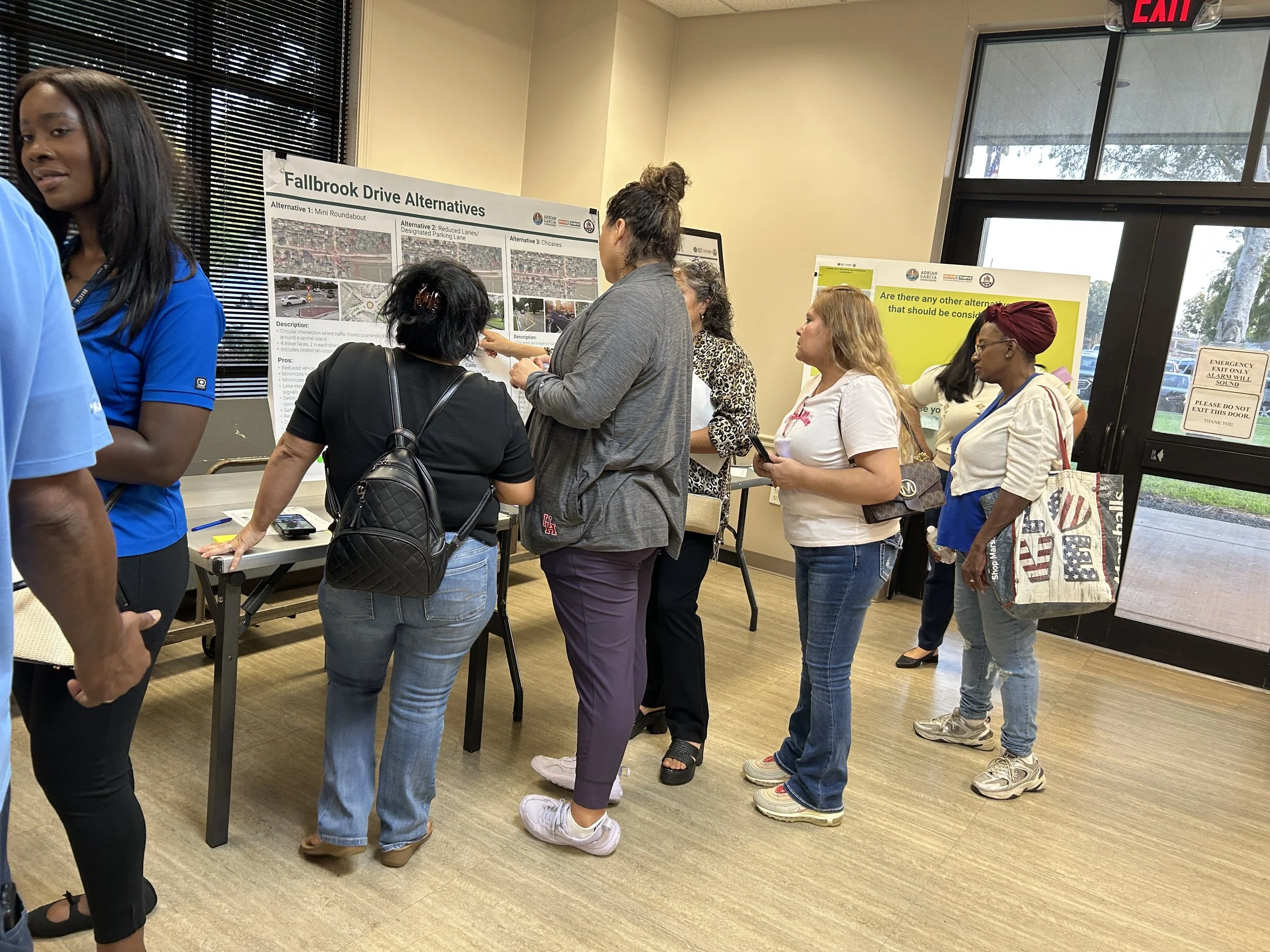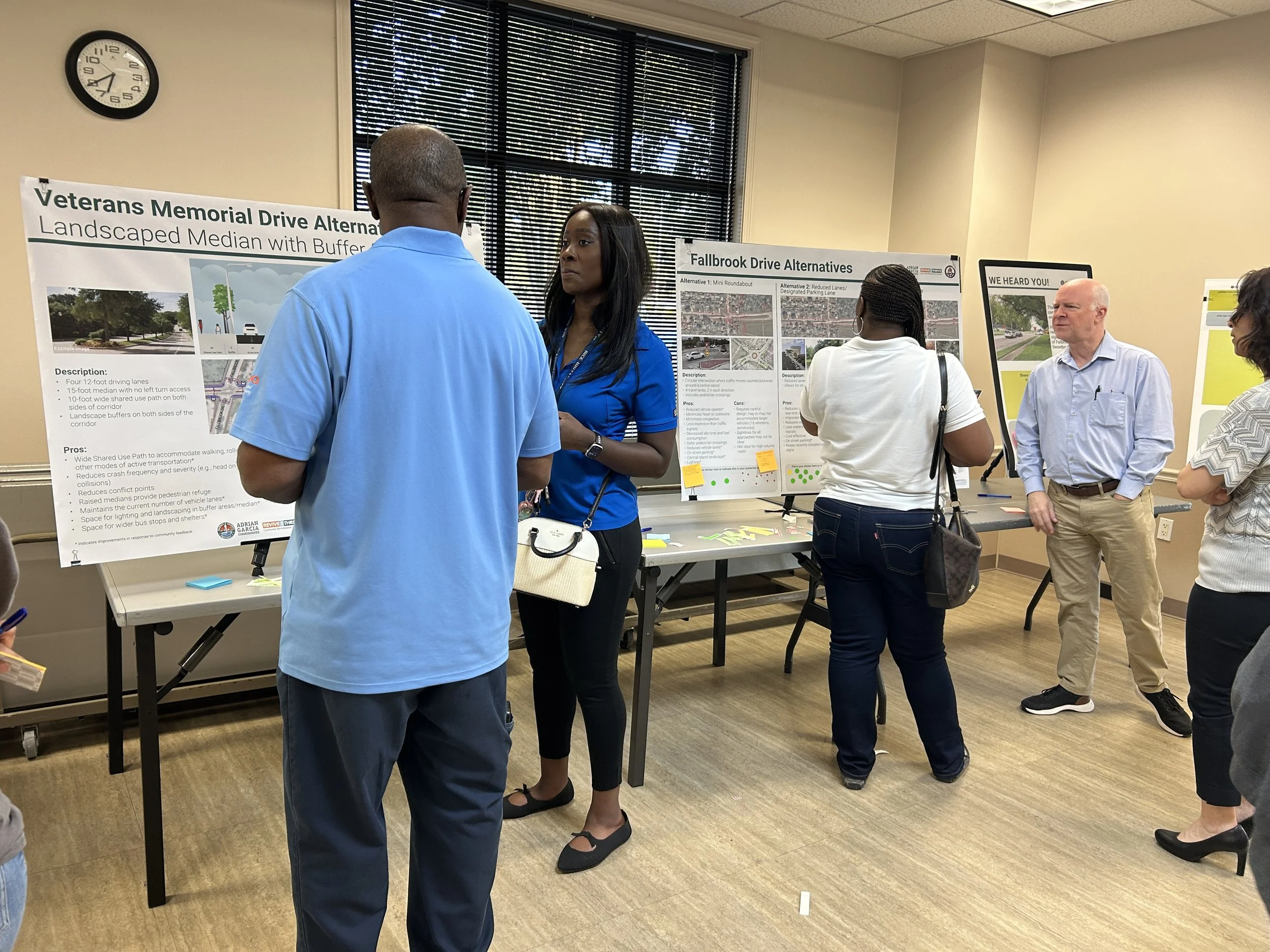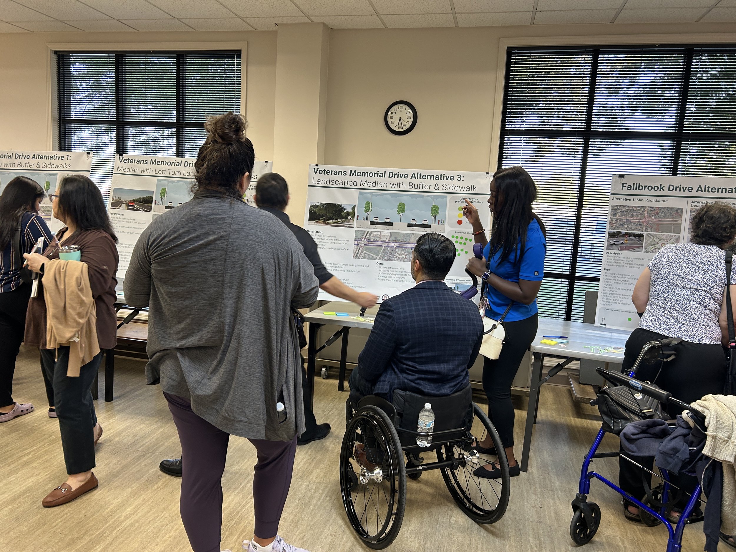Over 50 individuals joined us for the second Community Meeting, held August 12, 2025, at Mangum-Howell Community Center. Participants had the opportunity to provide feedback on three design alternatives for Veterans Memorial Drive, three traffic calming options on Fallbrook Drive, as well as completing a survey and comment card.