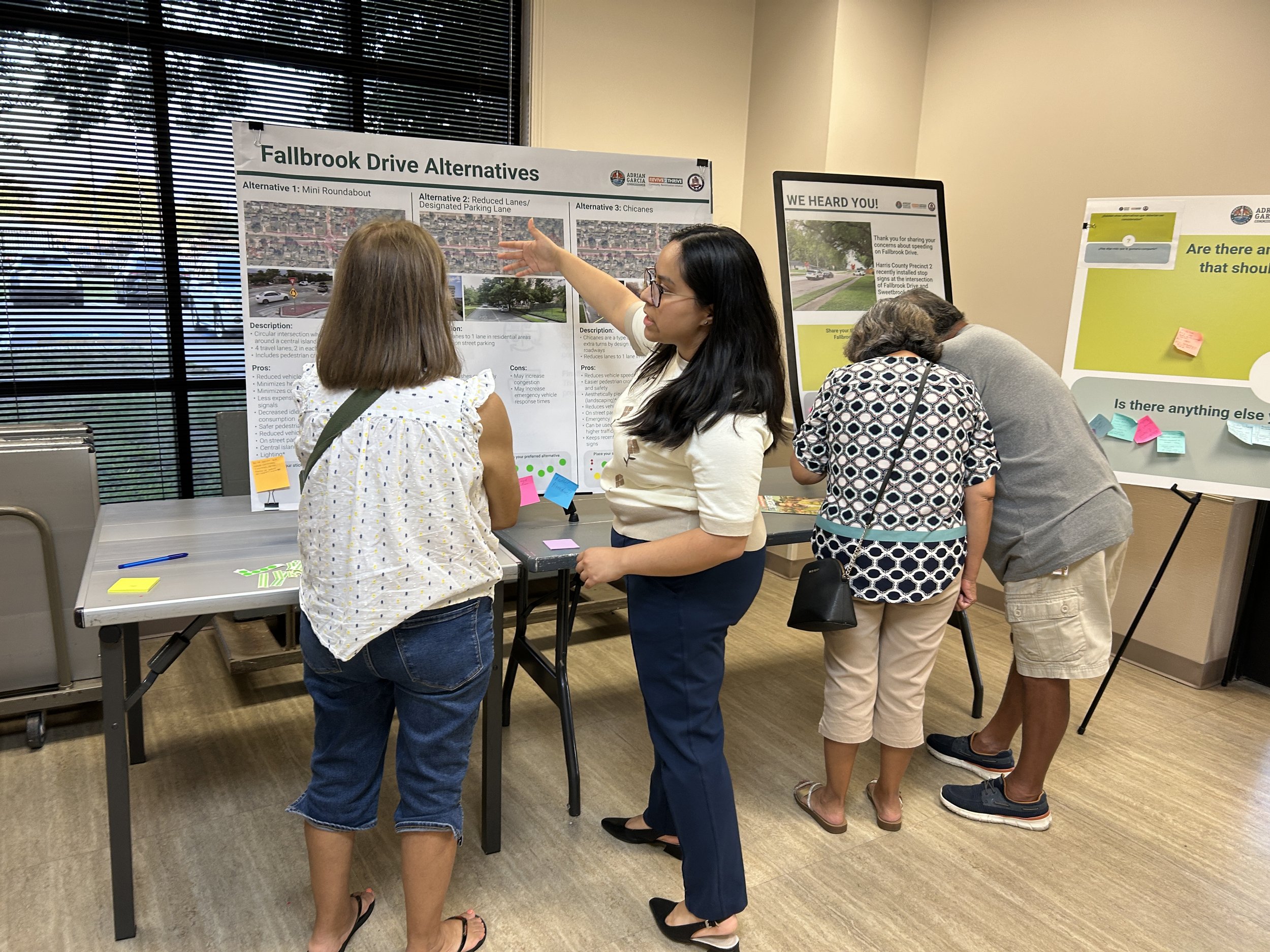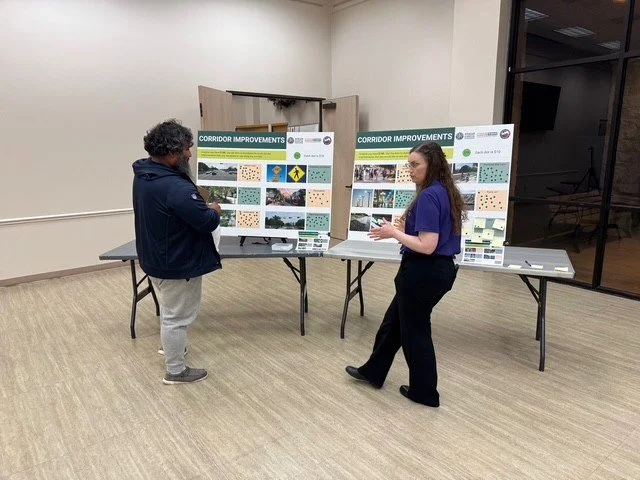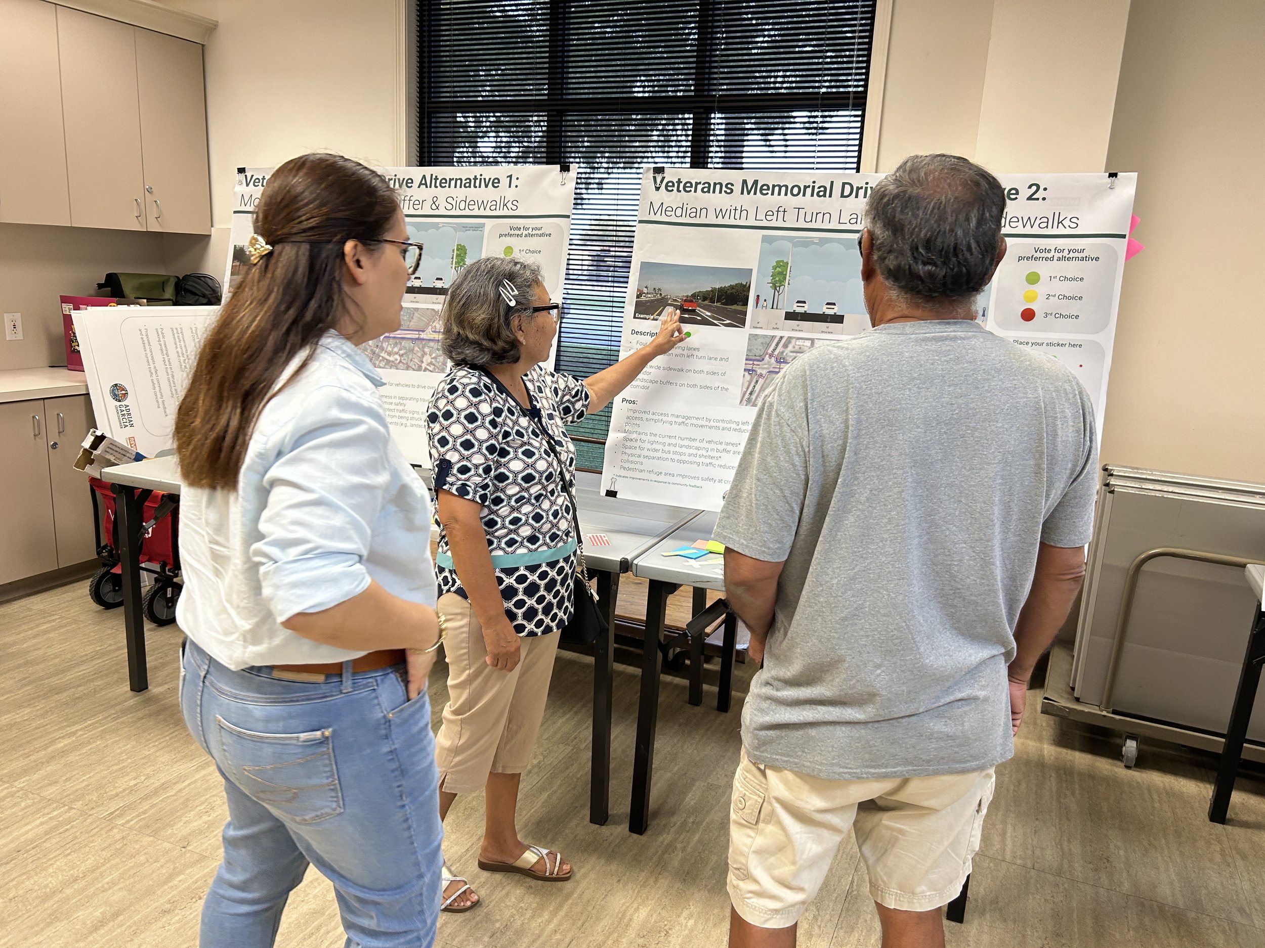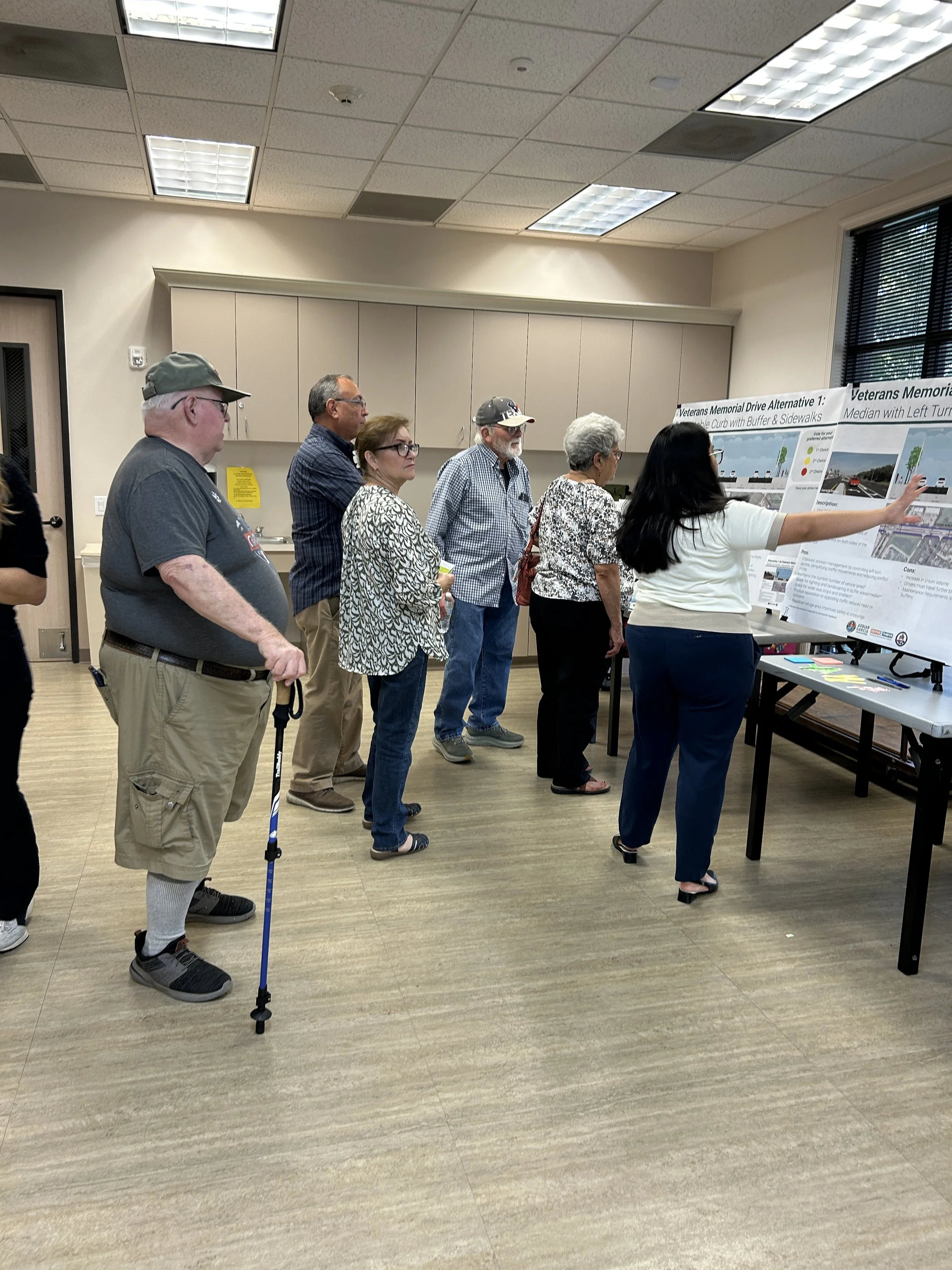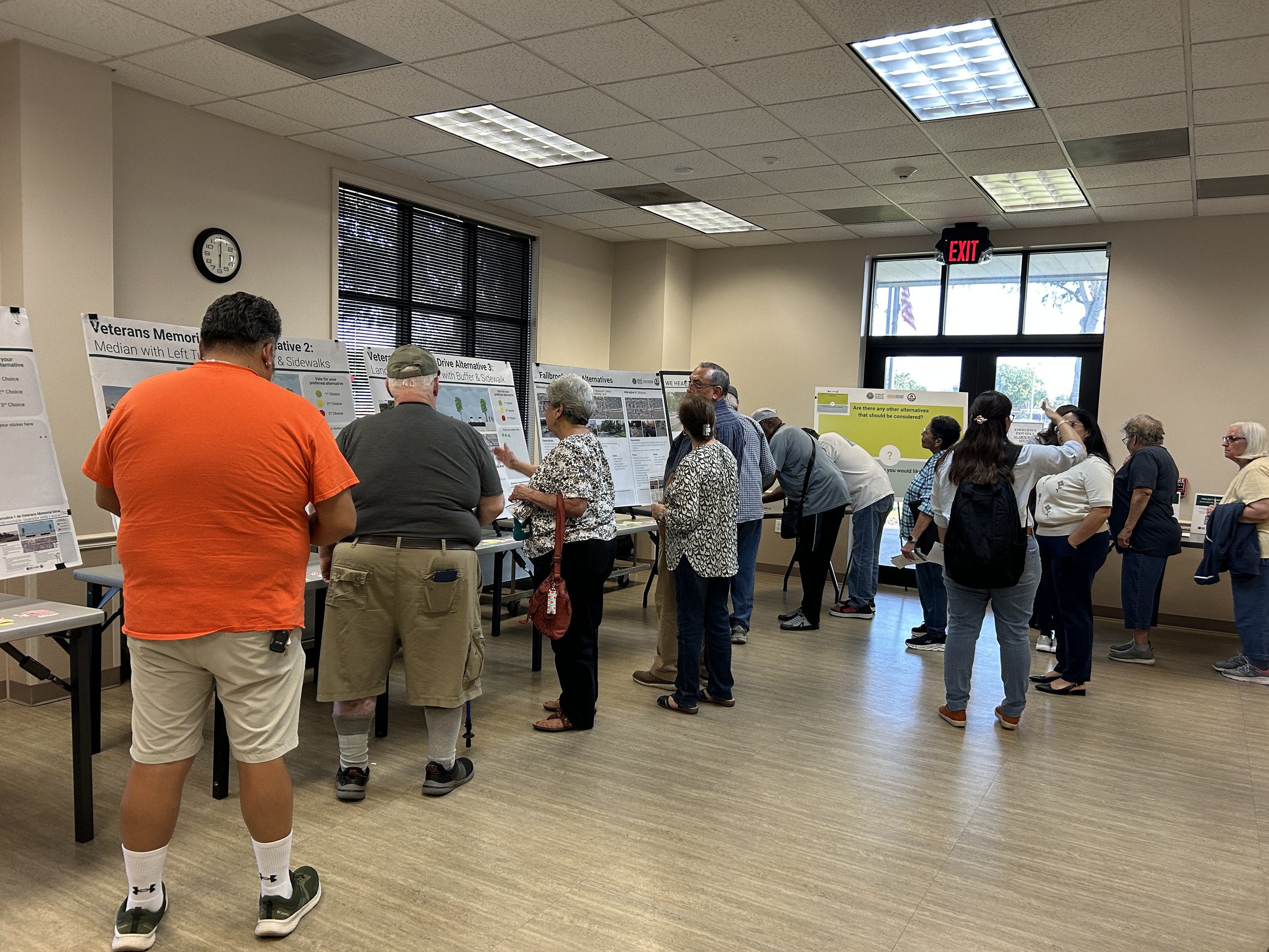 Over 50 individuals joined us for the second Community Meeting, held August 12, 2025, at Mangum-Howell Community Center. Participants had the opportunity to provide feedback on three design alternatives for Veterans Memorial Drive, three traffic calming options on Fallbrook Drive, as well as completing a survey and comment card.