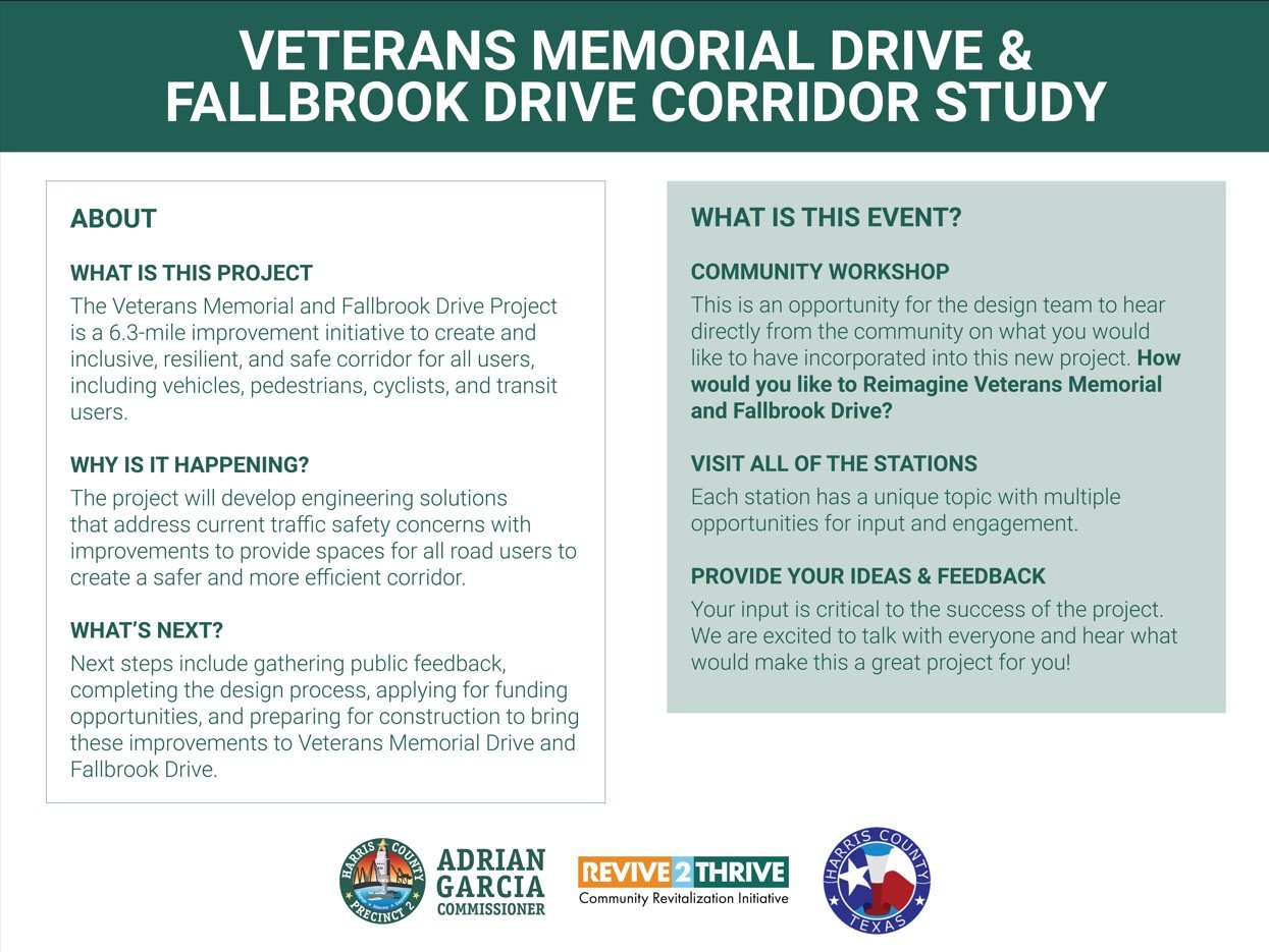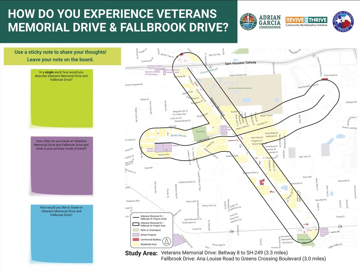 This board provides information about the Reimagine Veterans Memorial and Fallbrook Drive Corridor Study and the community meeting.