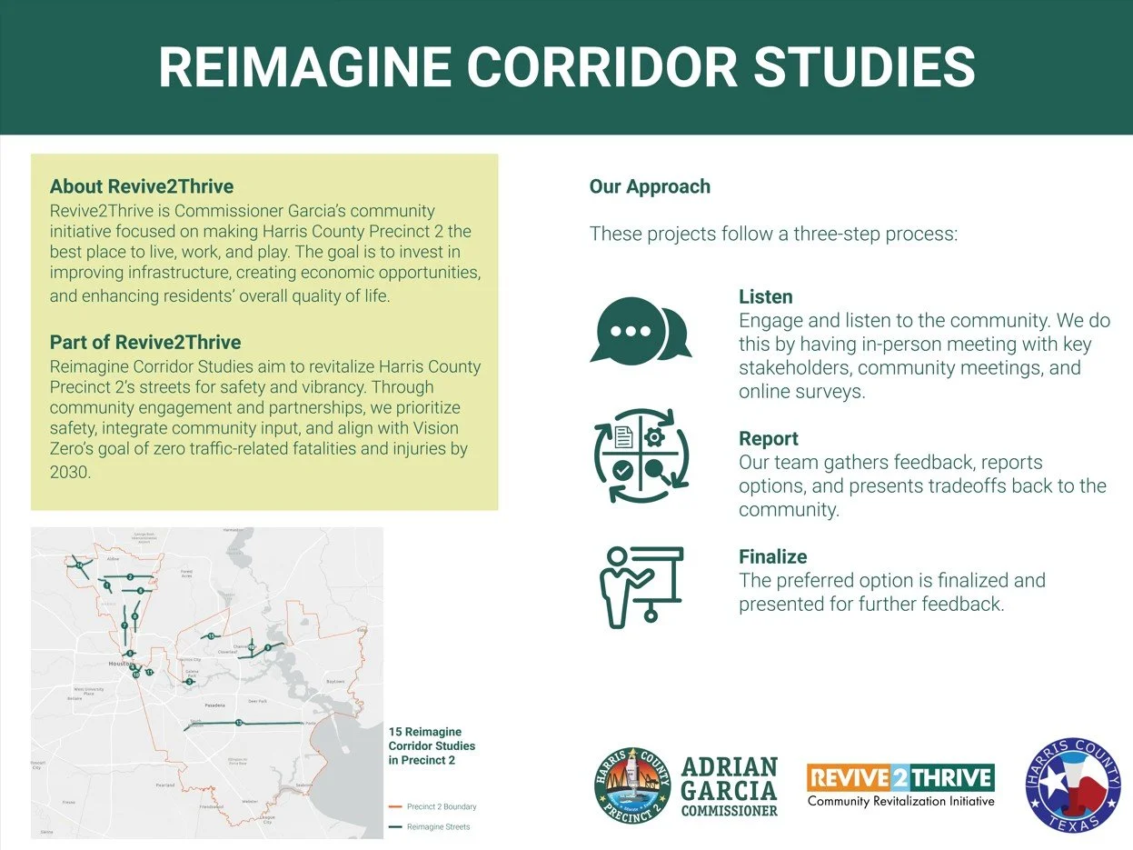 The board provides an overview of the Reimagine Corridor Program, Revive2Thrive Initiative, and the approach to community engagement and project development: Listen, Report, Finalize.